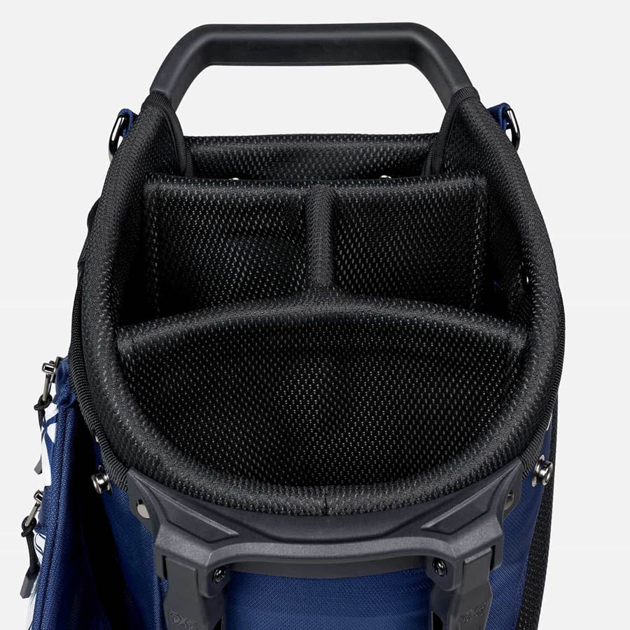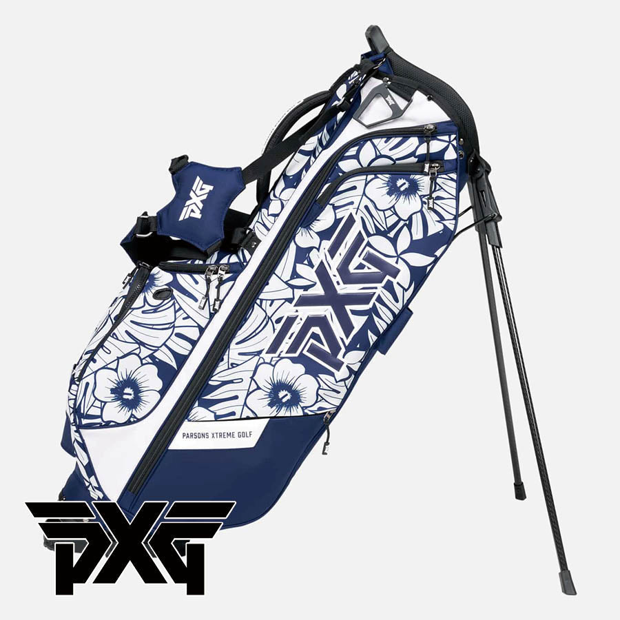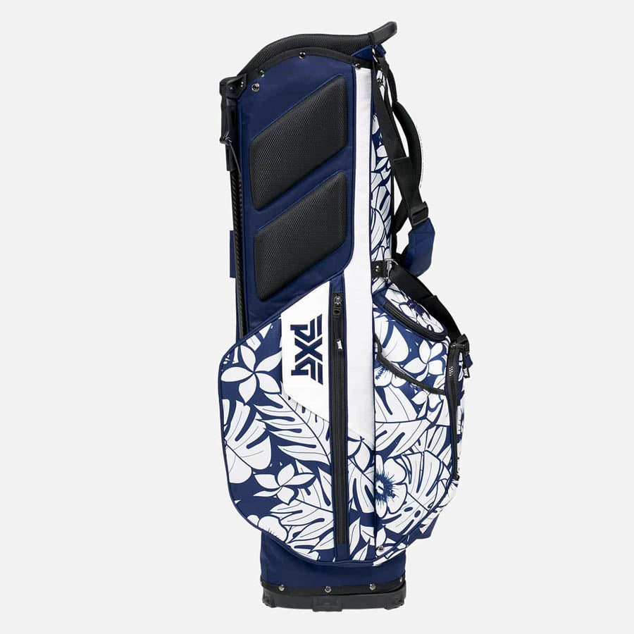 アロハ・キャリー・スタンド・バッグで、あなたのプレーに楽園の味を加えよう。ウォーキングに最適なこの華やかなバッグは、重さわずか4.6ポンドで、丈夫なポリエステル織物製。合計13個のポケットを備えた4ウェイ・トップ、バックパック・スタイルのデュアル・キャリー・ストラップ、パッド入りのバックパネル、マグネット脚付きのカーボンファイバー製スタンド脚を備えています。ネイビーとホワイトの2色使いで、ハワイの葉と花をモチーフにした手描きの最新アロハ・プリントを施している。